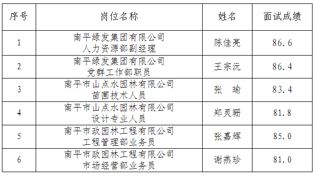 根據(jù)《南平綠發(fā)集團(tuán)有限公司招聘公告》,我集團(tuán)公司面向社會(huì)公開招聘工作已經(jīng)結(jié)束。現(xiàn)將擬錄用人員名單予以公示。