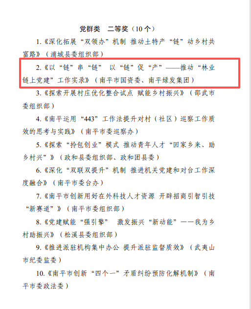 近期,由市直機(jī)關(guān)工委、市委組織部、市委改革辦、市發(fā)改委、市效能辦聯(lián)合組織開展的“第三屆全市機(jī)關(guān)體制機(jī)制創(chuàng)新優(yōu)秀案例征集評選活動”公布了獲獎情況。綠發(fā)集團(tuán)報(bào)送的《以“鏈”串“鏈” 以“鏈”促“產(chǎn)”——推動“林業(yè)鏈上黨建”工作實(shí)錄》案例,榮獲黨群類二等獎。