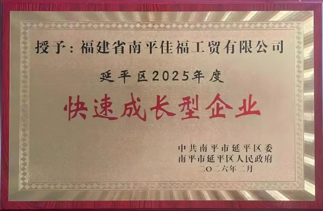 2026年2月26日,佳福工貿(mào)公司被中共南平市延平區(qū)委、南平市延平區(qū)人民政府授予“延平區(qū)2025年度快速成長型企業(yè)”榮譽(yù)稱號。